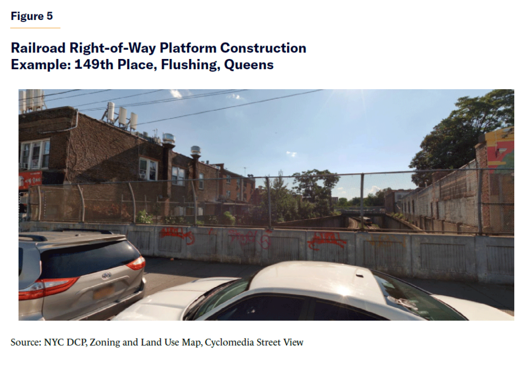 An example is a 60-foot-wide Long Island Rail Road right-of-way between 149th Place and 149th Street (a distance of 254 feet) in Flushing, Queens, immediately west of the Murray Hill station (Figure 5). The site, zoned R5 in a commercial district, would be allowed, under the proposal, four residential stories above ground-floor commercial space on a platform at each street frontage. Since MTA would be the land seller, it could presumably set suitable conditions to ensure continued rail operations. There are no land-use issues requiring further discretionary review by the city.