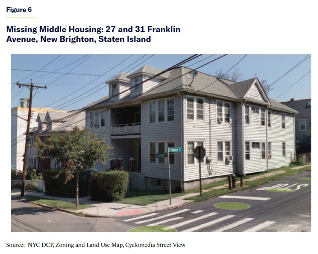 The missing middle housing prototypes cited by Parolek are uncommon in NYC, but, in such a diverse city, they can be found. For example, two fourplexes dating from the early 20th century stand at 27 and 31 Franklin Avenue in the New Brighton section of Staten Island (Figure 6). Each sits on a lot of about 5,000 square feet and has a FAR of about 1.2.