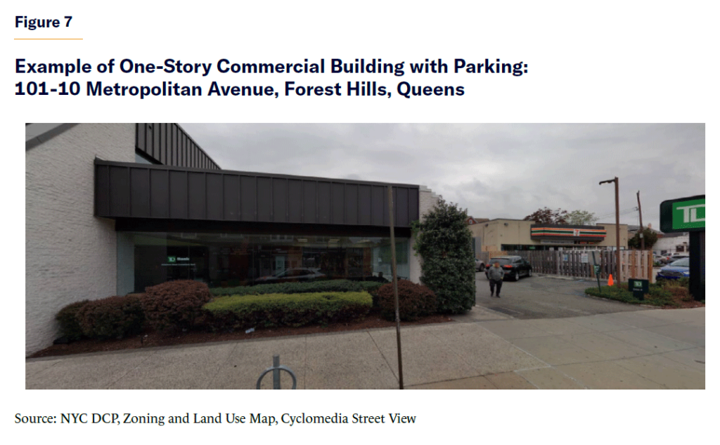 Figure 7 shows a bank building in Forest Hills, Queens, built in 2004.[82] Under the proposal, the owner could redevelop the parking lot as mixed-income housing at 1.5 FAR, with no parking. However, the owner cannot build more commercial space on the parking lot because, in that case,