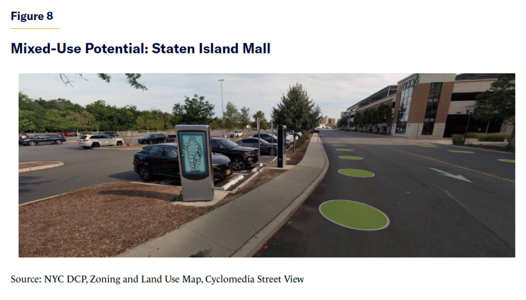 The proposals for low-density commercial districts omit C4-1 districts, which are mostly mapped over large regional shopping centers with outdoor parking lots. However, housing is also allowed, and the applicable residence district, R5, would get 2.5 FAR and five stories in a mixed-use building, were it in a commercial overlay district. In May 2022, I pointed out the housing potential of the open parking lot at the Staten Island Mall, zoned C4-1 (Figure 8).[91] As a regional facility, the mall needs parking, but not necessarily in an open lot. Shopping malls are job centers and often well accessed by public transit. Zoning for Housing Opportunity should allow them to take advantage of their mixed-use potential.