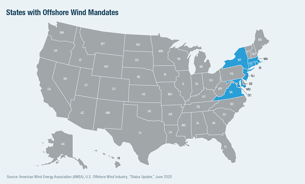 In September 2019, Virginia Governor Ralph Northam issued an executive order to develop at least 2,600 MW of offshore wind by 2026 and to develop an “energy workforce plan.”[51] That executive order subsequently was codified into legislation as the Virginia Clean Economy Act (VCEA), which calls for the state’s two largest electric utilities—Dominion Energy and Appalachian Power—to provide power solely from renewable generating resources by 2045 and 2050, respectively. VCEA includes a requirement that no less than 5,200 MW of offshore wind power be developed.[52] According to its backers, VCEA will create up to 13,000 new jobs per year and $69.7 billion in net benefits for Virginians.[53]