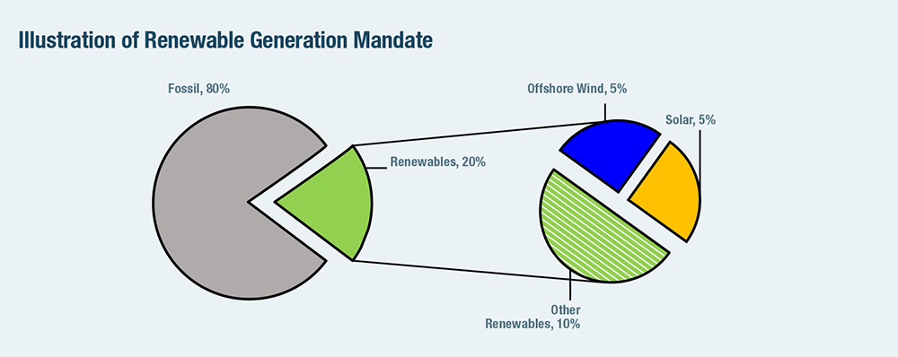 If the utility does not own any renewable generating plants or have existing contracts with renewable generators, it can use RECs to meet the renewable energy mandate. Typically, an offshore (or onshore) wind project creates one REC for each MWh of electricity that it generates. As renewable energy mandates become more specific (e.g., X% of solar, Y% of offshore wind, etc.), they further restrict the ability of an electric utility to reduce the cost of the electricity that it sells to consumers.[33]