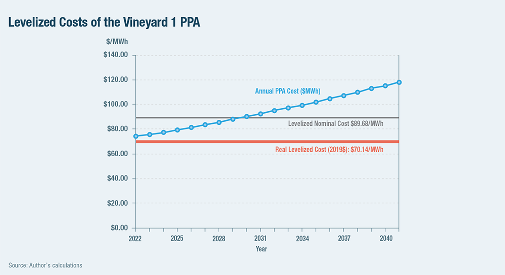 Levelized costs can also be adjusted by inflation. Assuming that the annual generation from the projects remains constant, the “real levelized costs” of electricity are straightforward to calculate.[38] The resulting cost can be viewed as a fixed mortgage payment in inflation-adjusted dollars. For example, the Vineyard Wind 1 Project has a first-year PPA cost of $74.00/ MWh, which escalates each year of the 20-year contract at a rate of 2.5% (Figure 4). Using EIA assumptions,[39] the real levelized cost (2019$) is $70.14/MWh, and the nominal levelized cost is $89.68/MWh.