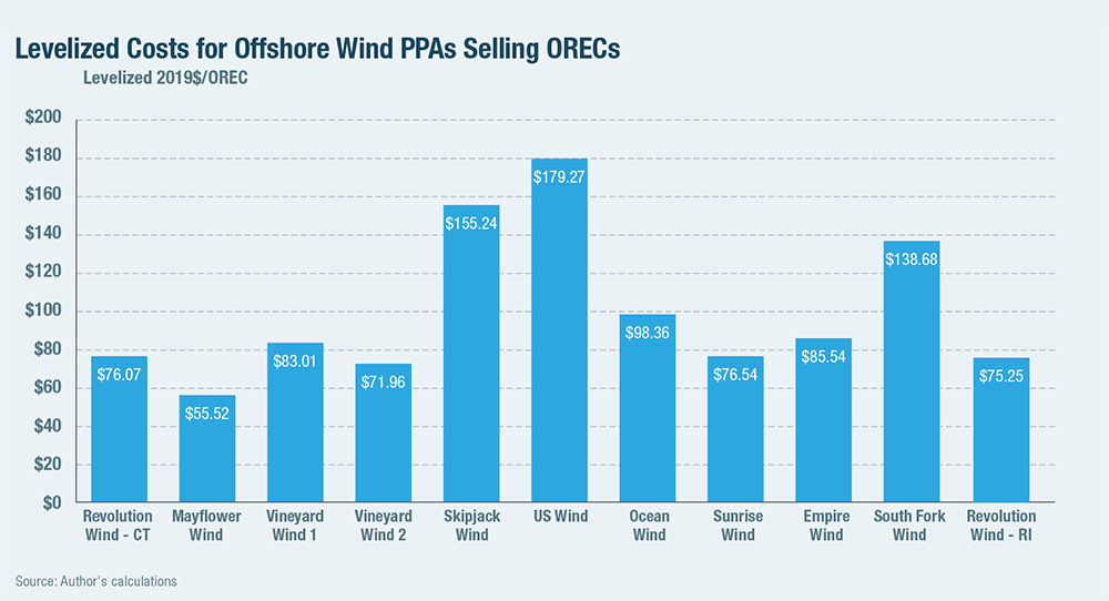 Figure 5 compares the real levelized costs in 2019$ for all 10 projects whose PPAs will sell ORECs to utilities. To be consistent with EIA’s LCOE and LACE estimates, the levelized costs are all adjusted to reflect an online year of 2025[40] and assume that there will be no reduction in output from the projects over time. As this figure shows, the levelized costs range between $55.52/OREC (Mayflower Wind) and $179.27/OREC (US Wind).