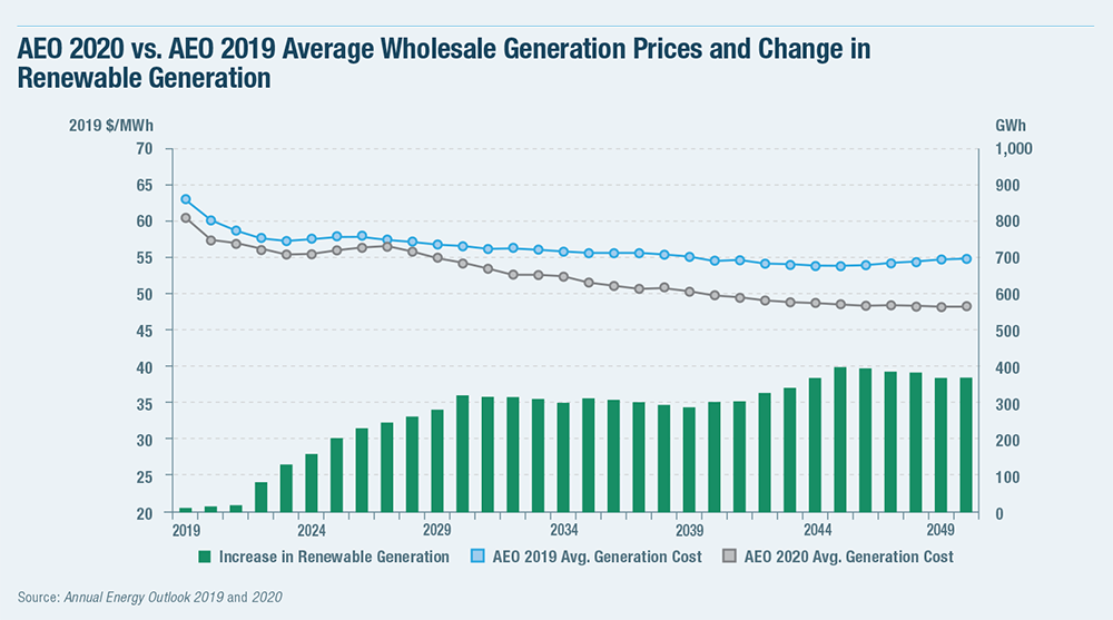 First: in its current Annual Energy Outlook 2020 (AEO 2020), EIA projects greater quantities of wind and solar power and lower real (inflation-adjusted) average wholesale generation prices than its previous forecast (AEO 2019). AEO 2020 projects that average wholesale market electric generating prices will decline by 20% between 2019 and 2050, from an average $61/MWh to an average $48/MWh in 2050.[69] AEO 2020 also shows an increase in renewable generation, when compared with its 2019 forecast, and lower generation prices (Figure 6).