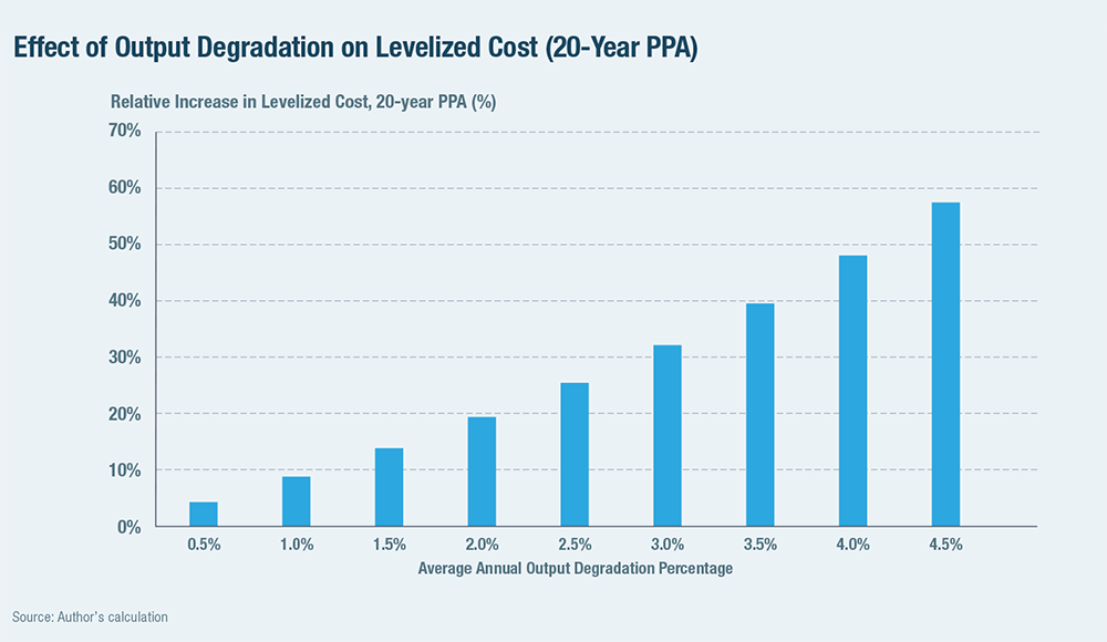 Output degradation over time will increase the actual levelized costs of PPAs shown in Figure 5. For example, if output degrades an average of 2.5% per year, the resulting increase in a project’s levelized cost is 22% for a 20-year PPA.[75] At the 4.5% average annual degradation rate calculated in the Hughes study, the increase in levelized cost is 58%, and, after 10 years, the expected output will be about half the initial output (Figure 7). Output degradation over time is likely to cause another hidden cost for consumers and taxpayers: the cost of project abandonment.