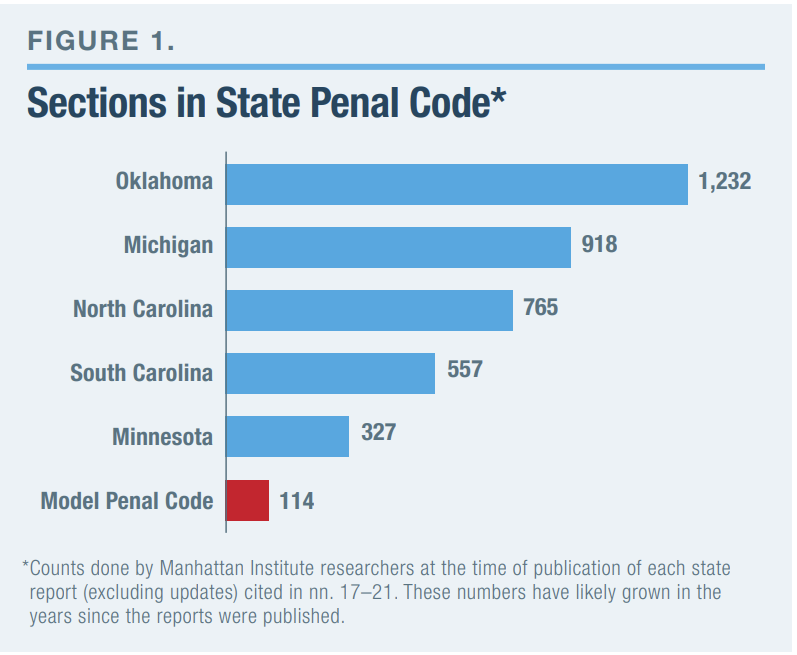In the Overcriminalizing America series of reports, Manhattan Institute scholars observed bloated criminal codes—sometimes several times larger than the Model Penal Code (Figure 1). (The Model Penal Code is a document drafted by the American Law Institute—an independent group of lawyers, judges, and academics—to “assist legislatures in making a major effort to appraise the content of the penal law by a contemporary reasoned judgment.”)[22]