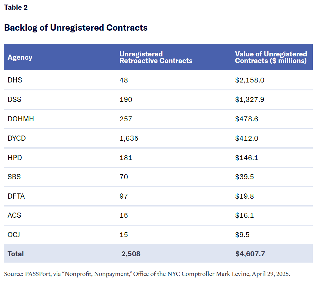 A second and major impediment is that the existing backlog of unpaid or unregistered contracts slows the entire process. The scale of unpaid invoices is substantial. An April 2025 snapshot of PASSPort records indicated more than 7,000 pending unpaid invoices across all contracts, totaling over $1 billion. Of this, at least $675 million was for services rendered in 2024 or earlier. Critically, approximately 4,000 of these invoices, valued at $861 million, were associated with nonprofit organizations. As of April 2025, 2,508 contracts, collectively valued at $4.6 billion, were awaiting registration even though their official start dates had already passed. While the mayor’s 2022 “Clear the Backlog” initiative temporarily reduced some of these figures,[12] the effort did not resolve the structural causes of delay; since then, the process has grown even worse.[13]
