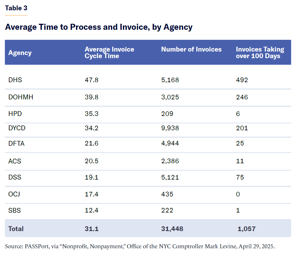 On the operations side, the comptroller’s office is pushing for more staff in agencies to speed up reviews, technical fixes to the PASSPort system to reduce glitches and paperwork, and the setting of firm deadlines for every part of the contracting process so that providers know when they will be paid. A similar recommendation for PASSPort was made by the Citizens Budget Commission (CBC).[15]