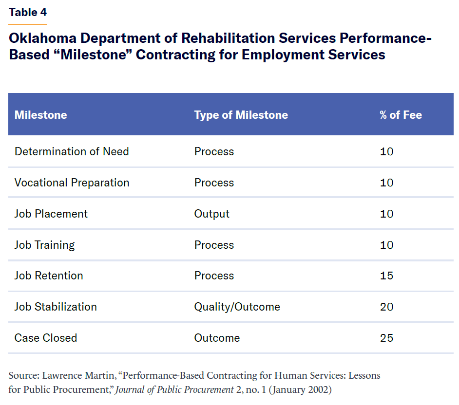 In 1992, the Oklahoma Department of Rehabilitation Services switched to performance-based contracting for a job placement program. Each client served by a contractor was treated as an individual case with a hybrid between cost-based and performance-based milestone payments. The contractor received 20% of the payment after there was a determination of need and sufficient vocational preparation. Then the contractor received increasing percentages of payment after the contractor reached certain milestones, such as job placement, training, and retention. The contractor received the bulk of the payment (45%) only after there was clear job stabilization for the future. The milestones are mapped in Table 4. Between 1992 and 1997, the wait time to receive services fell by 53%, job stabilization increased by 100%, and vendor costs decreased by 35%.[23]
