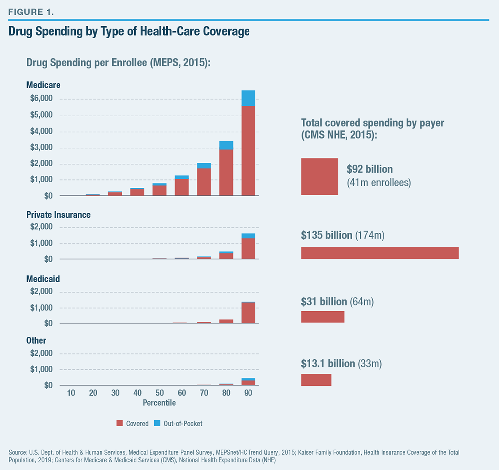 Private health insurance accounts for the largest share ($135 billion) of total prescription drug spending in the U.S., but Medicare is not far behind ($92 billion), despite covering far fewer individuals (174 million vs. 41 million, respectively). Medicare beneficiaries are more likely than individuals with private insurance to incur any drug costs, and those who do tend to incur much higher costs (Figure 1). Medicaid beneficiaries, by contrast, typically incur slightly lower prescription drug costs than privately insured Americans but do not face significant out-of-pocket costs.
