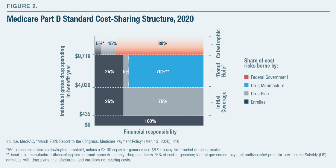 After the deductible, the member of a Part D plan enters the “initial coverage” phase—today, between $435 and $4,020 (Figure 2). The individual’s cost share (copay) today is 25%. After the initial coverage phase, enrollees enter a coverage gap called the “donut hole.” Originally, enrollees in the donut hole were responsible for 100% of drug costs until they reached the catastrophic coverage threshold—today $9,719. Congress reduced enrollees’ share of costs in the donut hole to 25%, mostly by requiring that drug manufacturers provide a discount to PDPs equivalent to 70% of drug costs incurred in the donut hole (PDPs are required to pick up 5%).