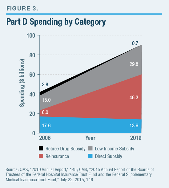 In turn, federal spending on reinsurance for the catastrophic portion of the Part D benefit has increased from $6 billion in 2006 to $46 billion in 2019, while the direct subsidy to PDPs has fallen from $18 billion to $14 billion (Figure 3). As a result, the Part D benefit has been transformed from an arrangement where most of the insurance risk is borne by PDPs to one where the cost of rising prices is mostly borne directly by the federal government.