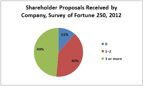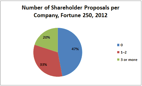 In 2012, the Fortune 250 public companies listed 303 shareholder proposals on their proxy ballots—1.21 per company, up slightly from 294 proposals (1.18 per company) in 2011. The number of shareholder proposals per company for the Fortune 250 is notably below the 1.43 in 2012 and 1.34 in 2011 for the Fortune 200, as documented in the fall 2012 Proxy Monitor report[2]—reflecting the shareholder-proposal activists’ focus on the largest public companies. While 47 percent of the Fortune 250 public companies had no shareholder proposals on their proxy ballots, 20 percent had three or more—again showing the skewed distribution of shareholder-proposal activism.