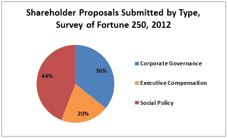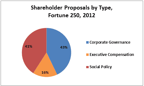 In 2012, 43 percent of shareholder proposals listed on Fortune 250 companies’ proxy ballots involved corporate governance issues (such as the annual election of directors, shareholder-voting rules, separation of the chairman and CEO positions, or the shareholders’ ability to take action outside annual meetings by written consent or through calling special meetings). Some 16 percent involved executive-compensation issues, and 41 percent involved social or political concerns unrelated to executive compensation or corporate governance.