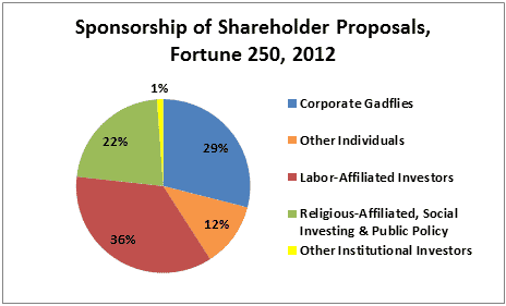 Consistent with prior years chronicled in other Proxy Monitor reports,[6] only 1 percent of all 2012 shareholder proposals on Fortune 250 companies’ ballots were sponsored by institutional investors without a social-investing or public policy purpose, or an affiliation with a religious or labor organization. Some 36 percent of all shareholder proposals were sponsored by labor-union pension funds or other labor-affiliated investment vehicles. And 40 percent of proposals were sponsored by individuals, but over 72 percent of those were sponsored by three “corporate gadfly” investors[7] (Kenneth Steiner, John Chevedden, and Evelyn Davis),[8] along with their family members and family trusts. Excluding these three gadflies and three other, less frequently filing gadfly-type investors (James McRitchie and Gerald Armstrong, as well as social investor John Harrington), only 7 percent of shareholder proposals were sponsored by individual investors.