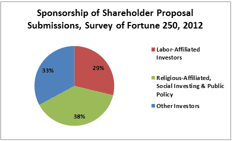 Although social-investing funds and public policy or religious groups sponsored only 22 percent of all shareholder proposals on proxy ballots in 2012—a decrease from historical trends, as previously reported[9]—this may understate their actual level of shareholder-proposal activity: Fortune 250 companies surveyed by the Society of Corporate Secretaries reported that 38 percent of all shareholder proposals they received were sponsored by religious-affiliated, social-investing, or public policy investors. Again, such disproportionate reported sponsorship may be due to bias in survey-response rate but may also reflect that such groups are more likely to drop proposals if management is willing to negotiate with them over their social or political concerns, or that this class of shareholder sponsor is more likely to submit proposals that the SEC finds technical defective.