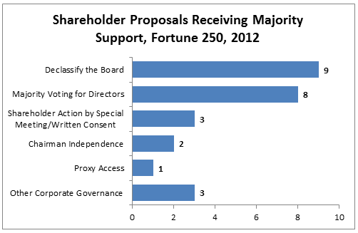 All told, 26 of the 303 shareholder proposals on Fortune 250 companies’ proxy ballots received the support of a majority of shareholders in 2012.[10] Each of these involved corporate governance issues. The proposals most likely to receive majority shareholder support were those seeking to “declassify” director elections (i.e., to elect all directors annually, rather than hold “staggered” board elections, which preserve board continuity but serve as anti-takeover devices that may, according to some empirical studies,[11] reduce share value). Nine such proposals received majority support, as well as eight proposals seeking to require directors to receive the support of a majority, rather than plurality, of voting shareholders for election. Other proposals receiving majority support included those seeking to permit shareholders to act outside annual meetings by written consent or by calling special meetings; those seeking to separate the positions of chairman and chief executive officer; and one seeking to grant shareholders “proxy access,” i.e., to place their own nominations for director on the corporate proxy ballot, subject to certain restrictions.[12]