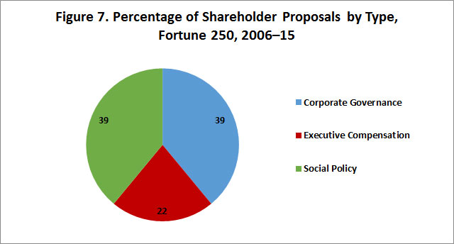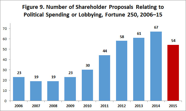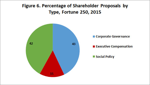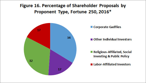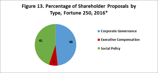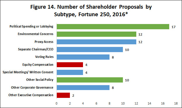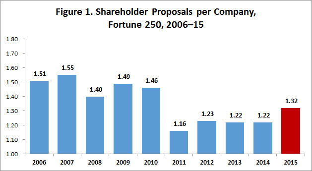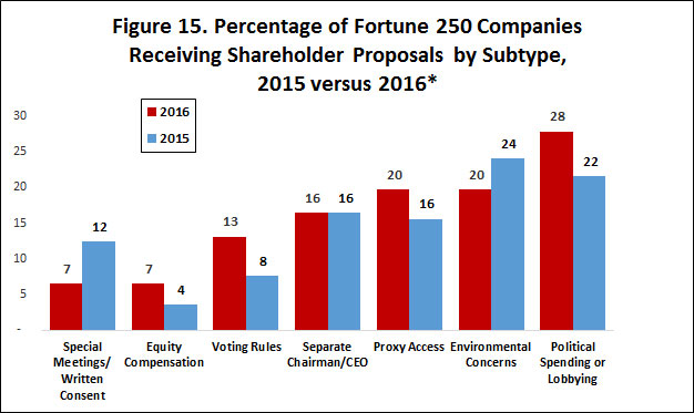 - The number of shareholder proposals is up: the average Fortune 250 company with an annual meeting scheduled by April 30, 2016, has faced 1.42 shareholder proposals, up 7.5 percent from all of 2015 and up 48 percent from the comparable period in 2015.