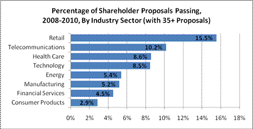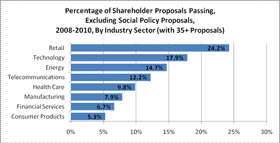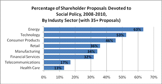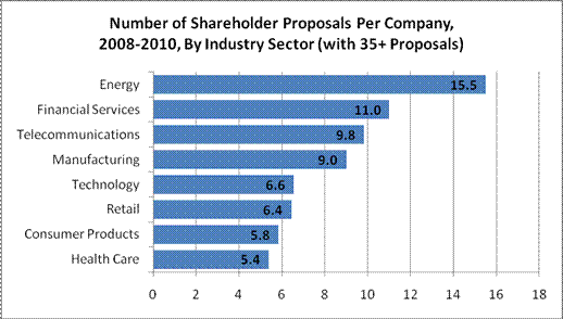 information in the Institute’s ProxyMonitor.org database of shareholder proposals submitted to Fortune 100 companies between 2008 and 2010—looked at how proposal activity varied by type (corporate governance, executive compensation, and social policy).[1] This finding looks at how proposal activity has varied by industrial sector, specifically asking: