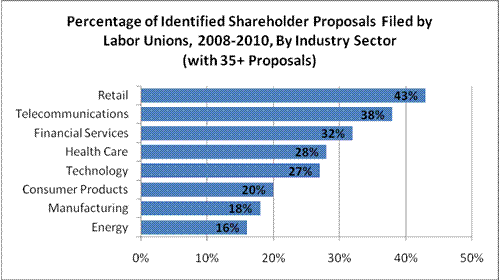 As shown in the graph, labor-union pension funds have been far more likely to submit shareholder proposals to companies in service-oriented fields (retail, telecommunications, and financial services) than in heavy industry or manufacturing fields (consumer-product manufacturing, industrial/general manufacturing, and energy). Such results are striking in that in general the latter fields are more likely to be unionized than the former: 8.8 and 11.6 percent of Americans employed in oil and gas extraction and manufacturing, respectively, are represented by unions, as compared to only 5.6 percent in retail trade and 2.5 percent in the financial sector.[6] Union funds’ decision to target companies in these lightly unionized sectors with shareholder proposals may reflect a desire to extract concessions from management rather than to maximize share value, as critics of union-fund shareholder activism have charged,[7] particularly in light of well-publicized recent efforts to organize these very sectors.[8]