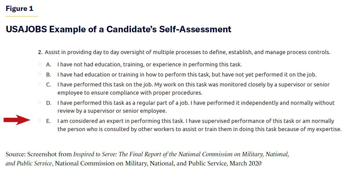 In some cases, agencies use software to match keywords in the requirements and to rate résumés. The National Commission on Military, National, and Public Service explained, “These approaches miss applicants with relevant skills and experience that do not lend themselves to an exact keyword match; they also advantage applicants familiar with the process who craft resumes that closely mirror job descriptions.” Worse still, agencies often rely on a candidate’s self-assessment as part of the application process (Figure 1). During the self-assessment, many job seekers indicate that they are an “expert” on every item, regardless of whether they are actually qualified, because they want to advance to the next stage of the hiring process. Meanwhile, highly qualified applicants who rate themselves honestly are rejected.[72] The Chance to Compete Act, passed in December 2024, allows a “subject matter expert” in an agency to develop job assessments “in partnership with human resources employees” and to “administer the assessment,” but doesn’t make clear how this will be implemented. President Trump issued an executive order to support the intentions of the act in January 2025.[73]