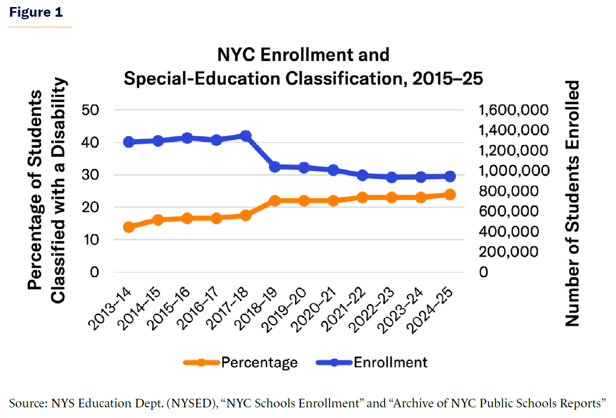 As shown in Figure 1, overall NYC K–12 enrollment declined from 1.3 million to approximately 946,747 between 2015 and 2025, and the proportion of students classified with disabilities increased from 17.5% to 24%.[27]