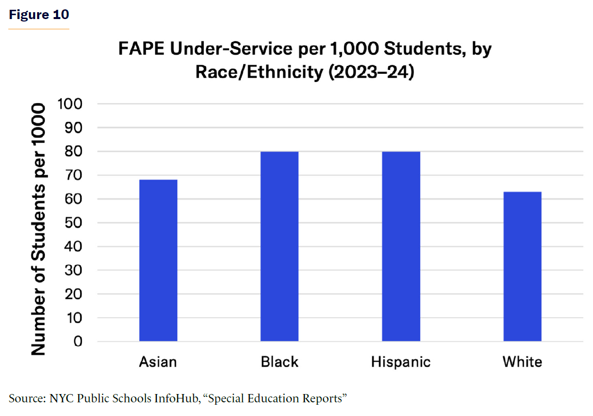 The implementation of special-education services has improved over time, but large gaps still remain. According to DOE, in 2023–24 many students continued to receive only some or no mandated services, both of which constitute noncompliance under IDEA. That academic year, about 80 of every 1,000 black and Hispanic students with disabilities received only some or none of their IEP-mandated services. By comparison, about 63 out of every 1,000 white students and 68 out of every 1,000 Asian students did not receive full services, as per their IEP (Figure 10).