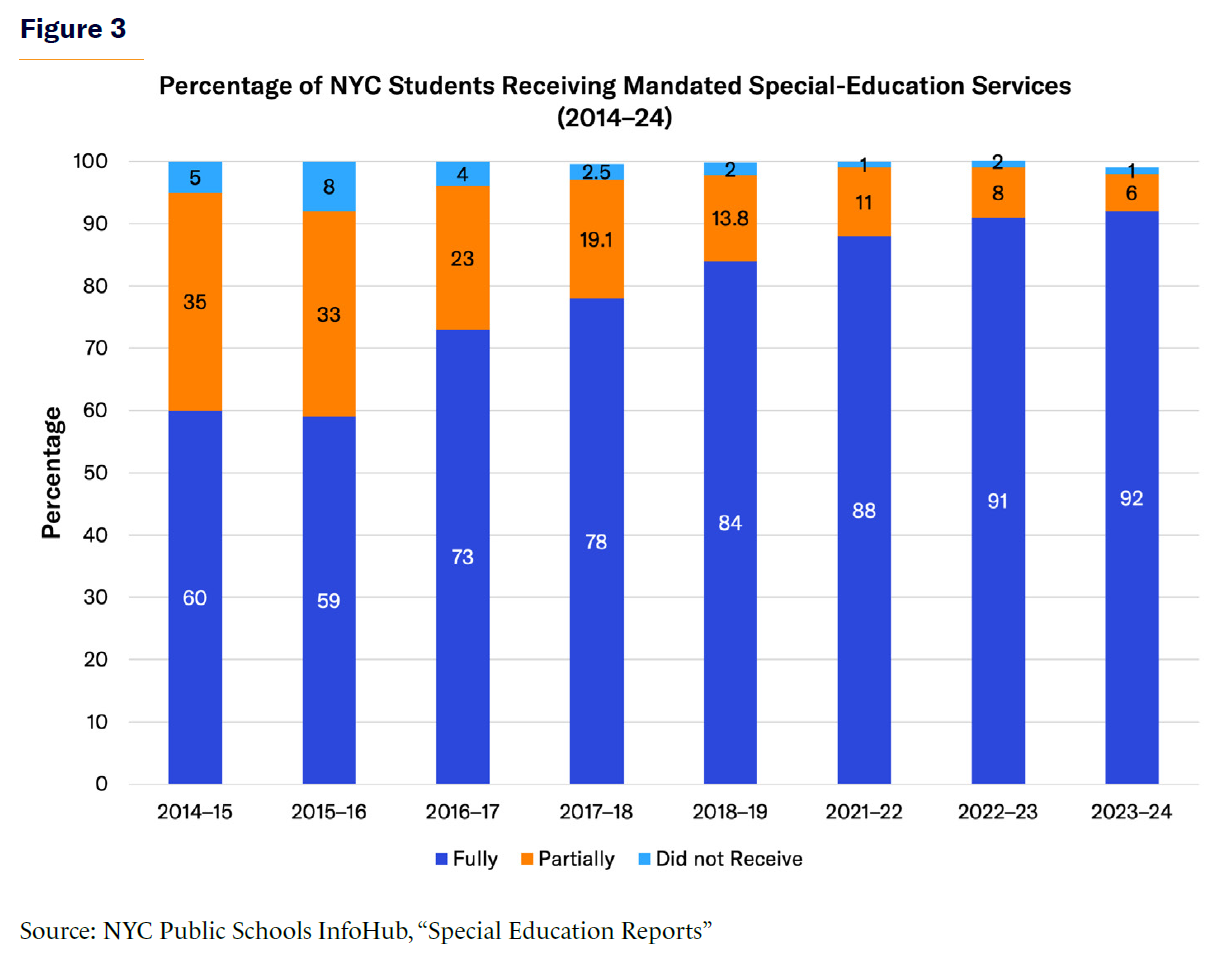 In 2014–15, the first year with publicly reported data, only 60% of students with disabilities received the services mandated in their IEPs.[28] The remaining 40% (69,046 students) received only partial services or no services at all. Compliance began to increase during the 2016–17 school year, when 73% of students fully received their mandated special-education services, while 27% (48,423 students) received some or no services. During the 2018–19 school year, fully mandated services were implemented for 84.3% of students, and 15.8% (25,960 students) received incomplete or no mandated services. During the 2022–23 school year, compliance exceeded 90% for the first time, 91% of students received fully mandated special-education services, and 10% (15,340) received partial or no services. The most recent public data for the 2023–24 school year showed that 92% of students received mandated special-education services, and 7% received partial or no services, totaling 13,003 students.[29] The 2023–24 school year coincided with a mandate issued by a NYC federal judge requiring 40 steps to eliminate delays in the provision of special-education services.[30]