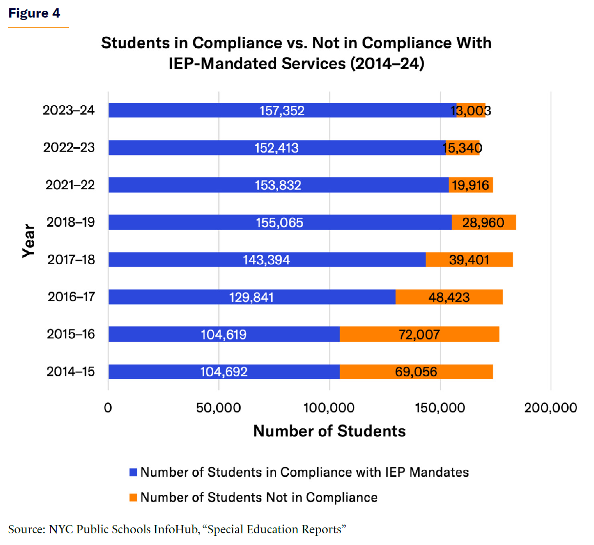 Under IDEA, failure to implement an IEP is itself a denial of FAPE. Families then turn to private providers and private schools to secure the services that DOE is unable to deliver. Even as the total number of non-served students declined, the system has never reached full implementation, leaving thousands of families with annual legal grounds for reimbursement.