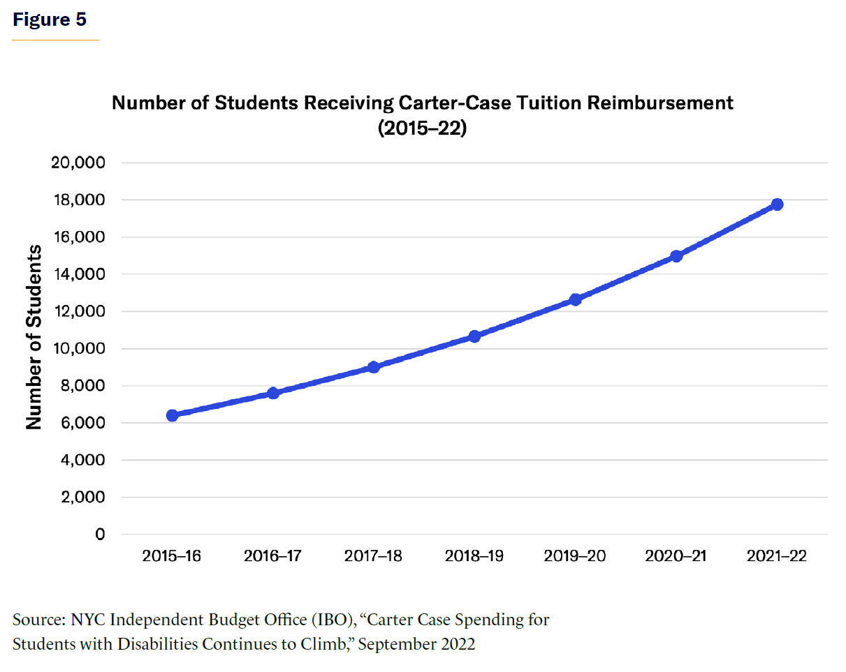 Between the 2013–14 and 2024–25 school years, the city’s rate of disabled students increased from 139 per 1,000 students to 242 per 1,000 students, a 74% increase (Figure 2). At the same time, enrollment decreased by approximately 340,000 students, moving these children either out of the city or into private instruction. In the latter case, parents seek reimbursement for their private school tuition through Carter cases.