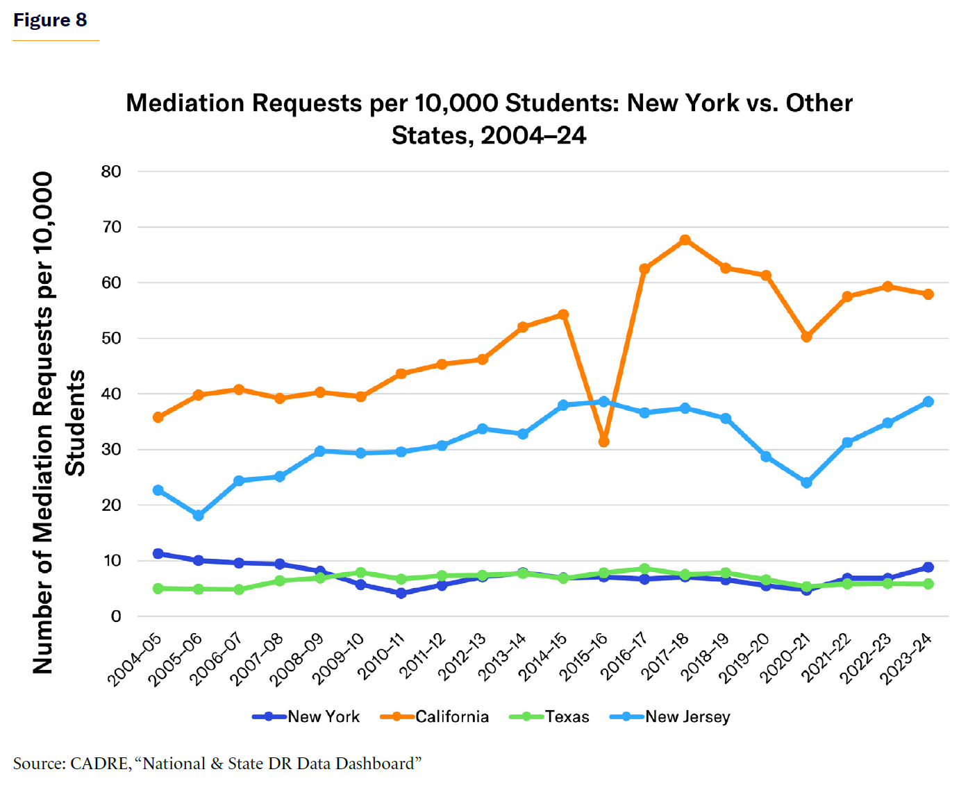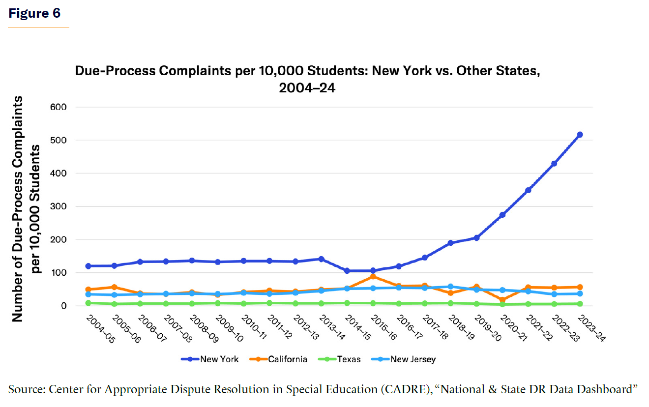 New York is a national outlier in the volume of special-education due-process complaints filed each year. Over the last two decades, New York has consistently received more filings per 10,000 students than any other large state. In 2004–05, New York reported 119.9 filings per 10,000 students, compared with 48.9 in California, 8.3 in Texas, and 34.5 in New Jersey. By 2018–19, the rate had increased to 189.8 filings per 10,000 students; by 2023–24, it had further risen to 517.1 in New York.[43]