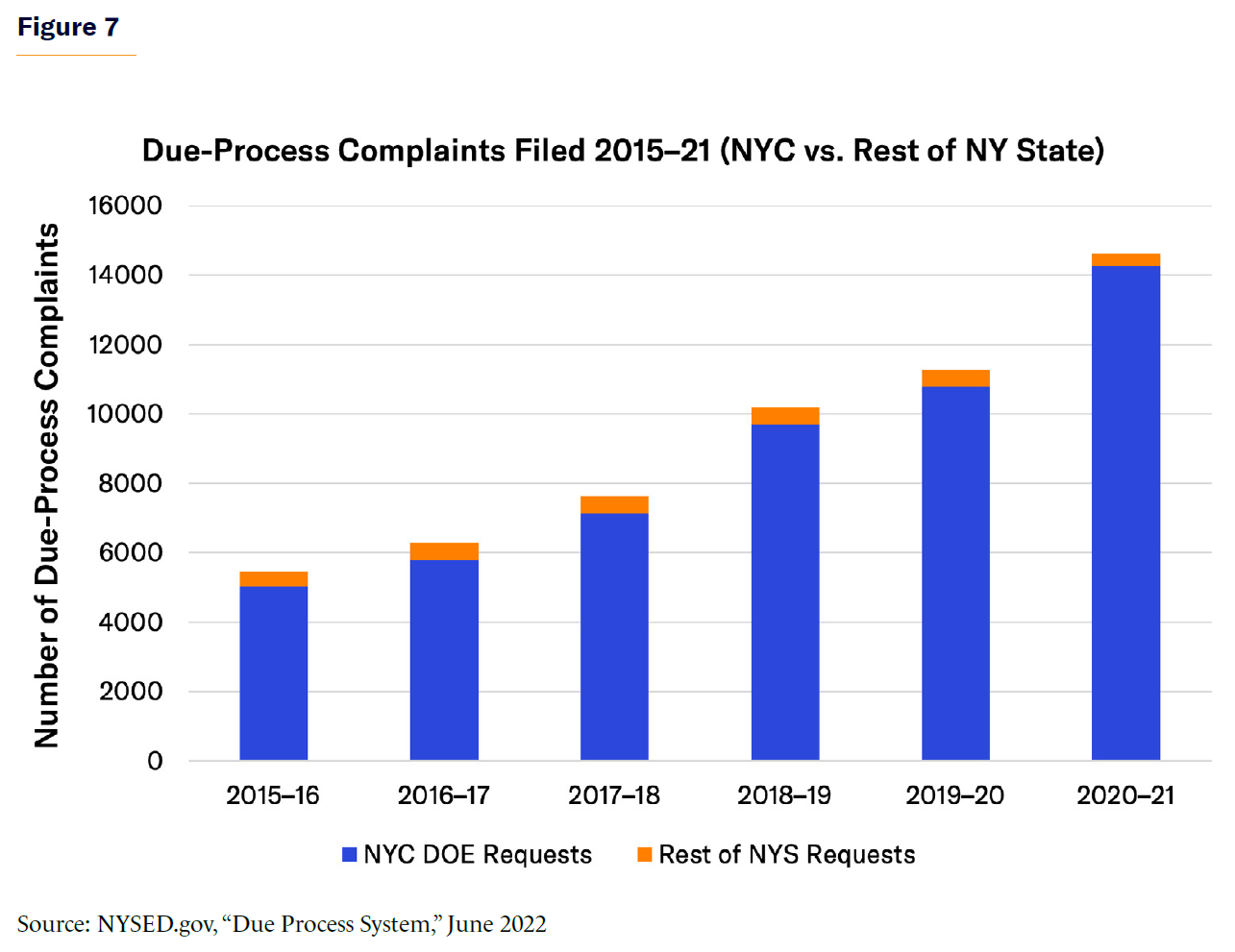 Between 2015–16 and 2020–21, NYC’s due-process filings nearly tripled, from 5,026 to 14,264, representing 92%–98% of all hearings statewide each year (Figure 7).[45] Over the same period, filings in the rest of the state decreased from 438 to 358. The large increase in due-process filings coincided with the de Blasio administration’s policy of settling most tuition reimbursement cases. These changes made a way for families to secure and maintain private placements and created a large backlog of unresolved cases, leading Mayor de Blasio, in the final days of his administration, to approve a major structural change: the transfer of all NYC special-education due-process hearings from the New York State Education Department (NYSED) to the Office of Administrative Trials and Hearings (OATH).[46]