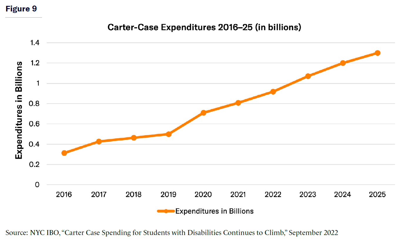 Carter-case expenditures have increased significantly over the past two decades. In 2005, NYC spent $47 million on Carter cases.[50] In 2010, that amount increased to about $143 million. NYC saw an increase of $312 million in the fiscal year 2016 to $1.3 billion in 2025. Beginning in 2020, spending increased from $499 million to $710 million in a single year. Increases have continued each year since: $807 million in 2021, $918 million in 2022, and $1.07 billion in 2023. By 2024–25, the city had spent $1.3 billion on Carter cases (Figure 9). This is equivalent to 3.25% of NYC DOE’s overall budget.