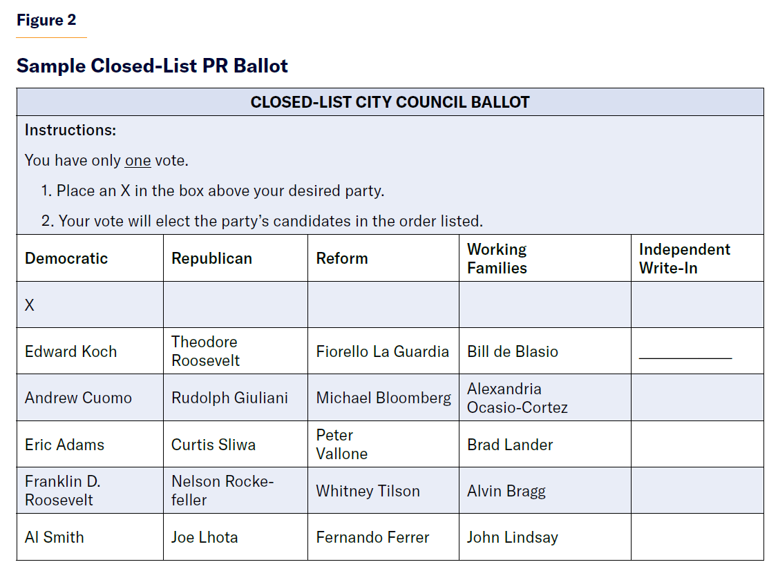 Closed lists shouldn’t be dismissed out of hand as nonstarters (Figure 2). The process of setting list order can involve a primary election, as was recently proposed in Wyoming.[59] And closed-list ballots often feature party leaders’ names or photos. This is consistent with presidential voting in most U.S. states, whereby voters have chosen party tickets since the Twelfth Amendment was ratified. Moreover, scholars who study women’s descriptive representation tend to recommend closed lists because such candidates can be distributed throughout a list to improve their prospects of election.[60] In short, closed lists may not be as unreasonable a reform choice as many have assumed.