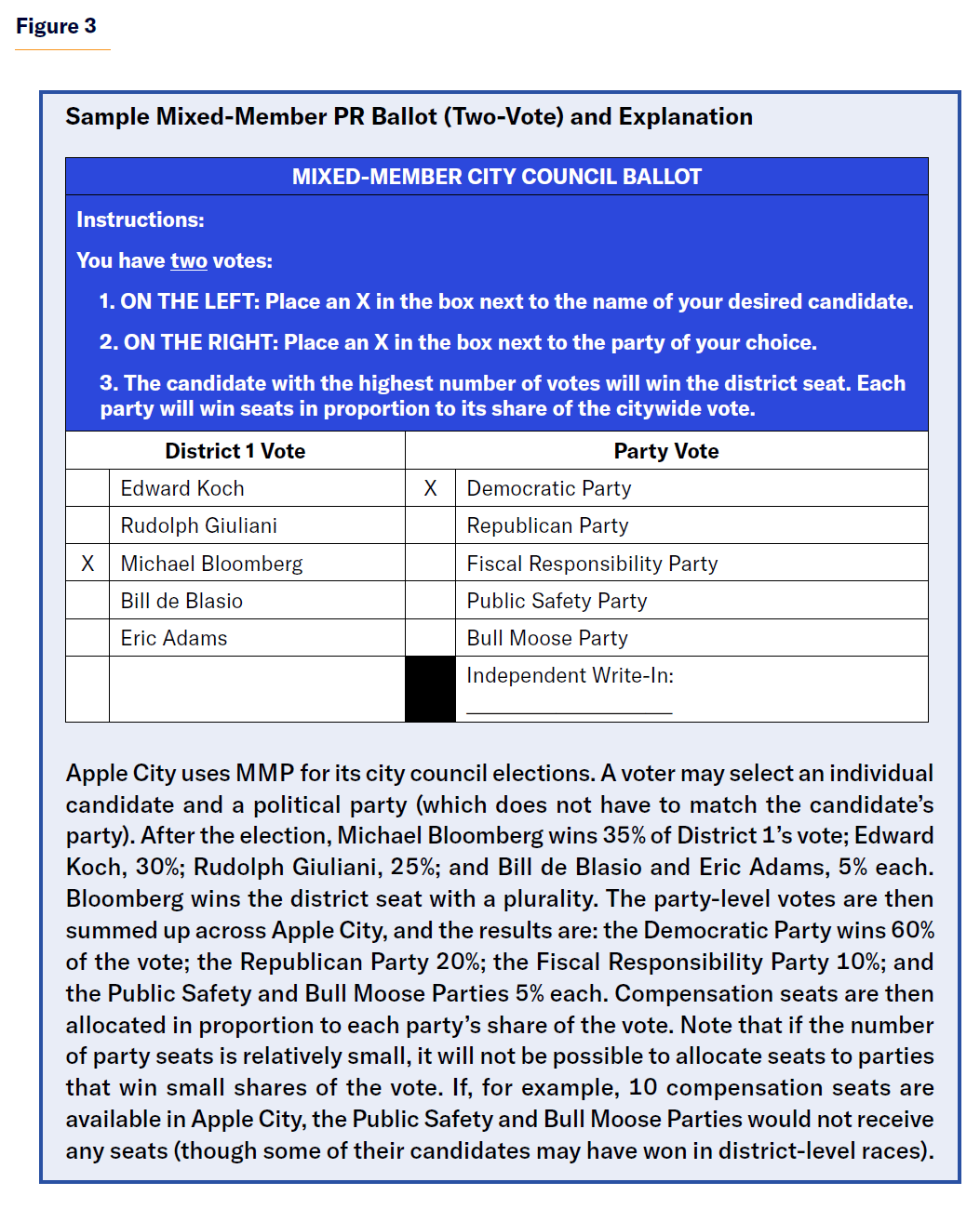 Single-seat districts—Forms of PR are available that incorporate single-seat districts (SSDs), or in which the district magnitude is equal to one. The paradigmatic example of this is mixed-member proportional (MMP) representation (Figure 3). The most common version of MMP gives voters two votes: one within their SSD, and a second for a party (sometimes called “compensation seats”). SSDs usually comprise most of the seats in the legislature, but not all; 33%–50% of seats might be set aside for party-list allocation (usually with closed lists). Determining winners involves, first, using whatever rule applies to the SSD, which is almost always plurality. Second, the compensation seats are distributed to each party in proportion to their vote shares earned in the party-level vote, taking account of seats already won in the SSDs.[63] The system thus combines SSD seats with seats allocated from closed lists.