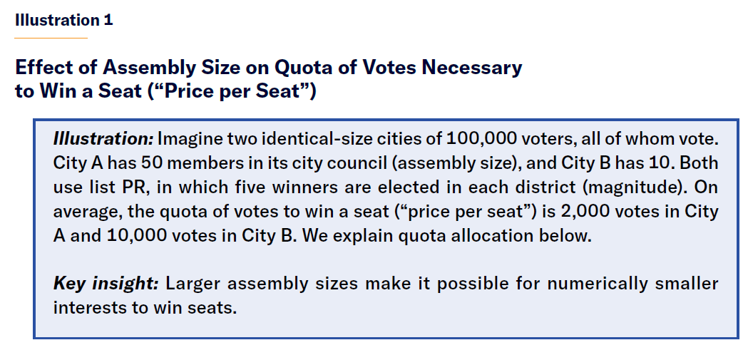 Assembly size—The number of seats on a city council, known as assembly size, exerts the greatest influence on how many interests can win direct representation (Illustration 1). Take a city in which 10% of voters choose Bull Moose Party candidates. Assuming party-loyal voting, the council must have at least 10 seats for a Bull Moose candidate to win one. Assembly size is therefore at least as important as the choice of a model electoral system if one aims to take representation seriously. Recent research also shows that large U.S. cities’ councils are much smaller, on average, than those of similar-size cities in other countries.[57] This is largely a result of the Progressive Era’s nonpartisan reforms discussed above. Reductions in assembly size should be scrutinized closely, even if they are twinned with reforms otherwise seen as desirable.[58]