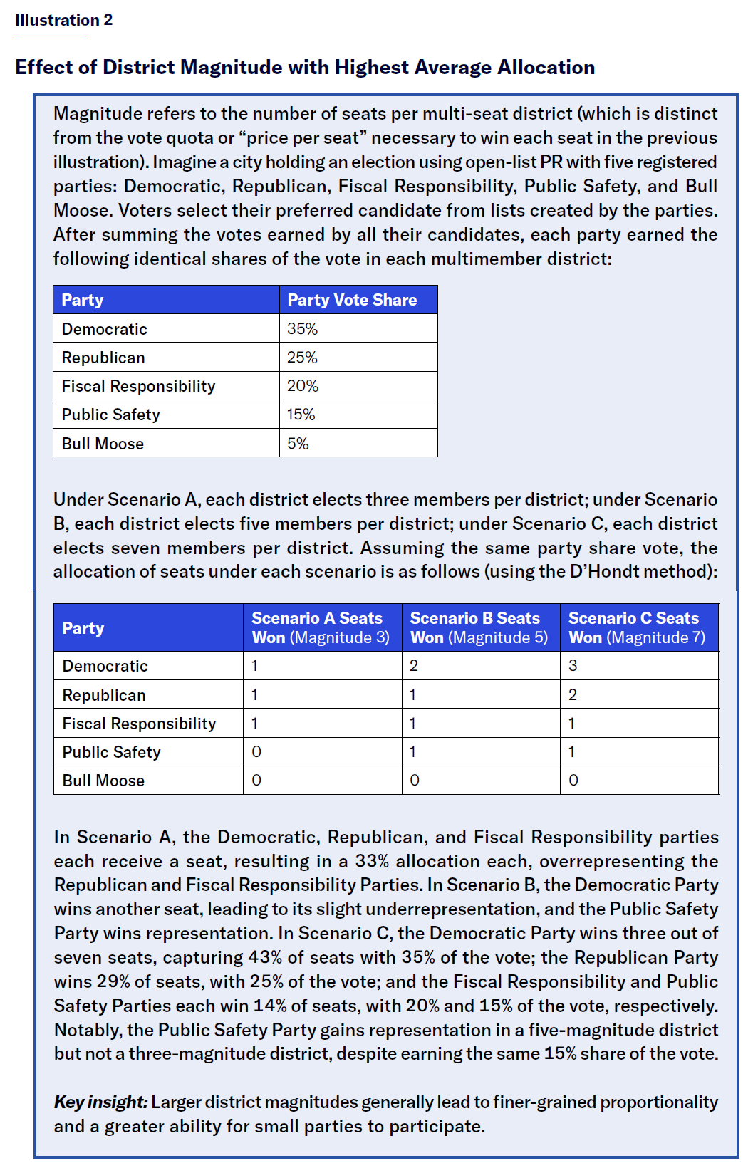Allocation rule—List systems allocate seats to parties in either of two main ways. One is to calculate a quota by dividing total votes cast in a district by that district’s magnitude. Another is to distribute seats one by one, giving the seat at each round to the party with the highest average number of votes per seat that it already has. There are several variations on each process, and these are debated in practice for whether they might favor small, medium, or large parties.[62] Illustration 2 uses a common highest-average method over a range of district magnitudes.