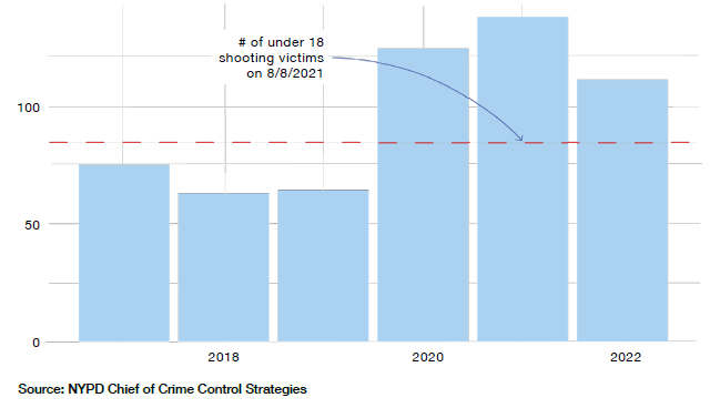 Youth gun crime in the city has also increased by almost 200%. In 2017, 30 identified shooters were under 18. In 2022, as of August, there had already been 85. Youths are also the victims of gun crime about three times as often as they were five years ago, with 36 victims under 18 in August of 2017 and 111 to the same month in 2022 (Figure 1).