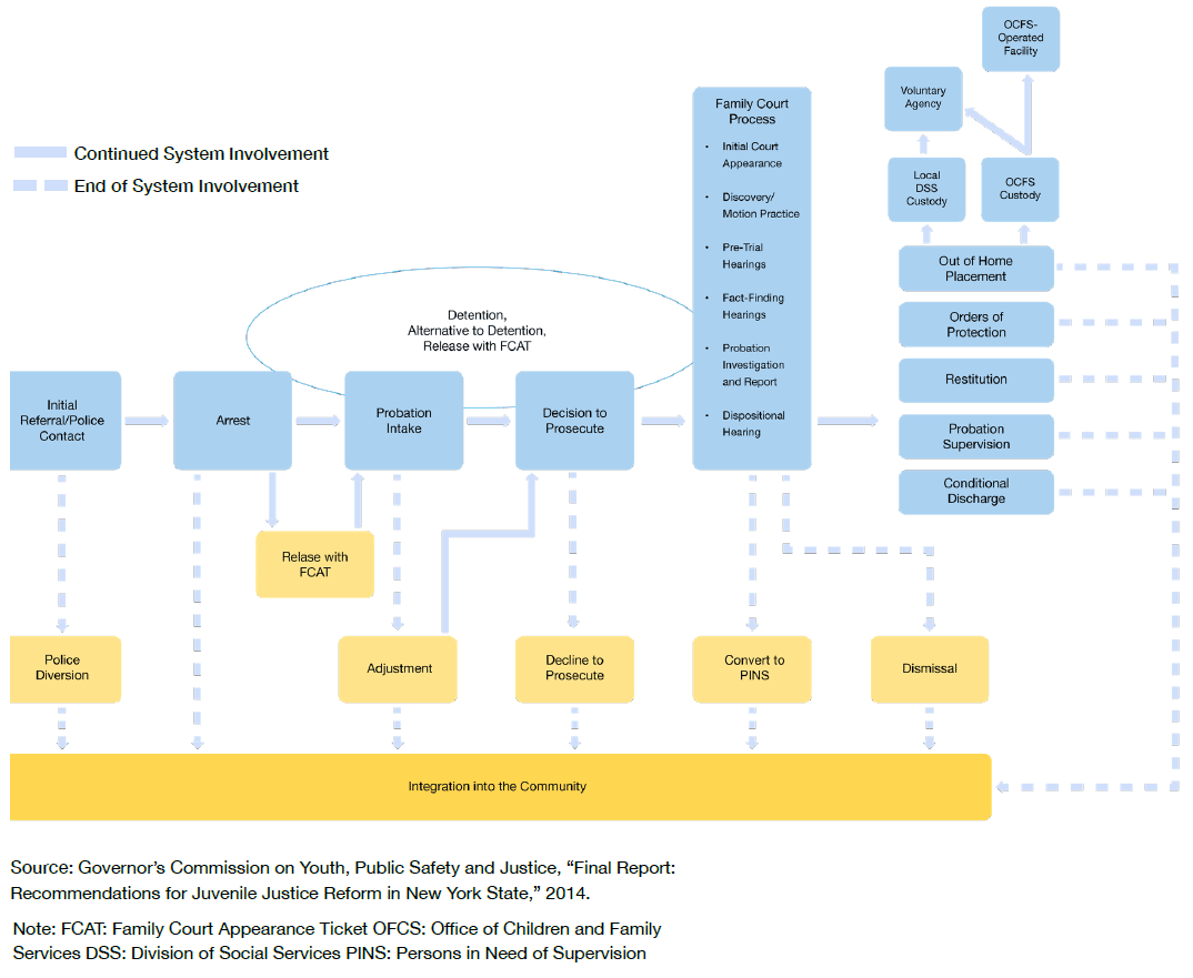 Once in family court, most defendants will never see a judge. They will receive diversionary adjustment by the probation department, and their case will be closed. This is because, in family court, the goal is integration and rehabilitation. The process starts with the probation department holding a preliminary conference with the arrested individual and, if possible, the victim. Probation officers determine whether the matter can be diverted from formal family court proceedings through what is called an “adjustment,” which may provide services and require participation in community service. Ultimately, the offender enters into a “Reparative Agreement, which details activities to be completed by offenders in order to repair the harm that was caused.”[33] This also offers a chance for the Department of Probation to screen and assess individuals for behavioral health disorders, which is valuable, even if the treatments available are sometimes suspect.