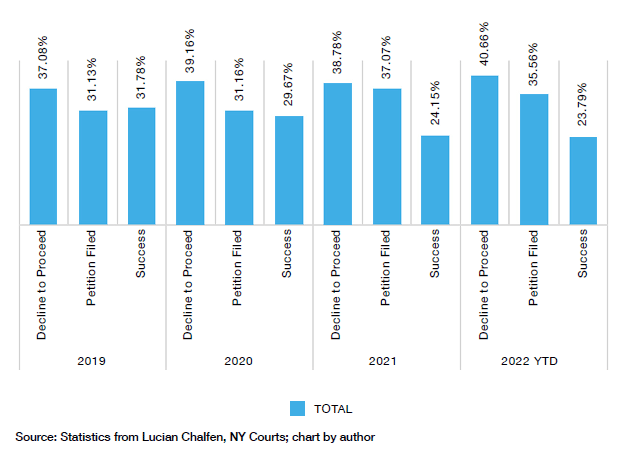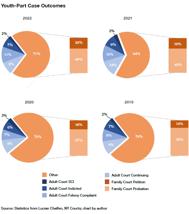 But most cases are removed. For three of the last four years, judges have sent over 70% of the cases heard in adult court to family court.[32] In 2021, 64% of youth-part cases were removed.