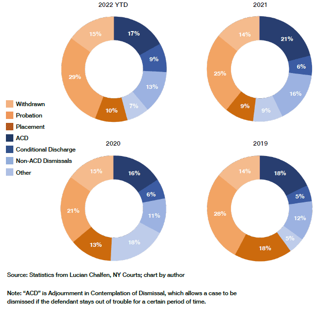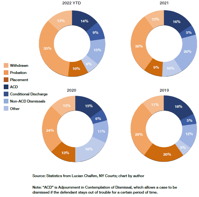 Finally, there is a lack of transparency. The courts have done a good job in the last three years of collecting and displaying statistics. But this is not true for RTA cases. Before we can evaluate the impact of the law, we need meaningful access to granular data on case outcomes. It should be possible to learn, for example, what portion of arrests for criminal possession of a weapon in the first degree are removed to family court, as well as how many end in probation without a family court appearance. This will require the court system to coordinate with the NYPD and other state law-enforcement agencies.