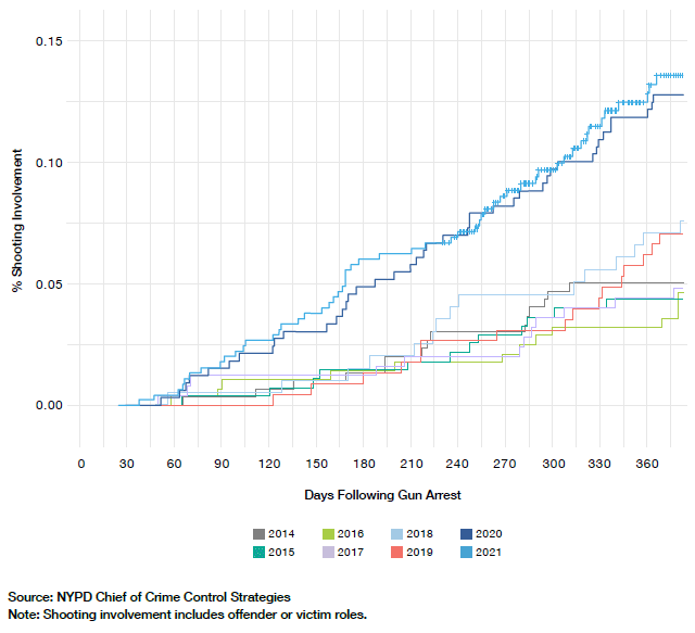 NYPD’s Office of Crime Control Strategies found that “the relationship between youth gun arrests and subsequent shooting involvement (i.e., as an offender or victim) has grown substantially worse over the past few years.”[8] In 2017, 4.4 out of every 100 individuals arrested with a gun while under 18 years old were involved in a shooting within a year. By 2020, that number had nearly tripled, to 12.9%. In 2021, it was up to 13.7%. The two-year shooting involvement rate jumped from 6.7% in 2017 to 23.4% in 2020.