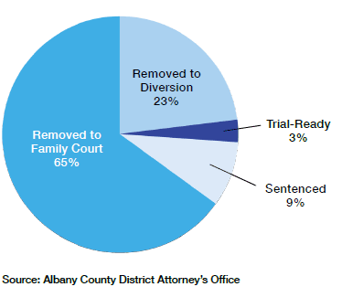 Outside Gotham, cities are faring little better. Some of the best data on the effects of RTA, however, come from Albany County, where District Attorney P. David Soares decided to keep track of cases that started in the youth part, as shown in Figure 3. Note that one defendant may have multiple cases in these charts.