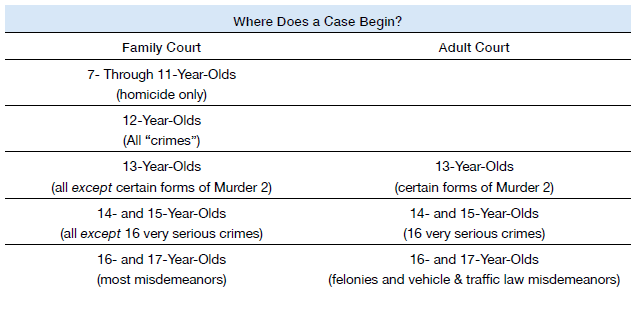 For 16- and 17-year-olds, the system is more complicated. If they are charged with a misdemeanor (except vehicle and traffic offenses),[23] they are automatically sent to family court to face juvenile delinquency proceedings.