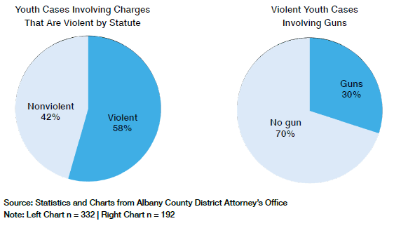 Lest one think that most youth-part cases are nonviolent, statistics from the Albany County District Attorney’s Office prove otherwise (Figure 6). Since RTA began, 58% of youth cases would be considered violent criminal cases if committed by adults. Of that grouping of violent cases, 30% (or 58) were violent because they involved guns.