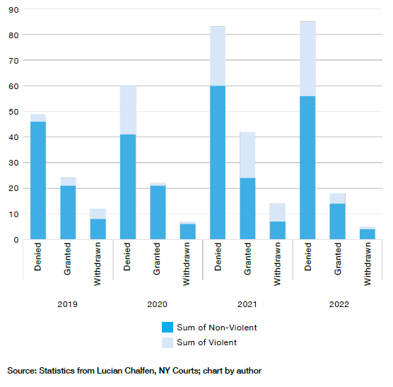 The results are striking. As Figure 8 shows, in 2019, judges denied about as many extraordinary circumstances motions as they granted. Now, they deny about four times as many as they grant. This barrier did not have to exist. Had the legislature simply said that AOs start in the family court rather than in front of a family court judge, there would have been little question that the family court could rely on its own records.