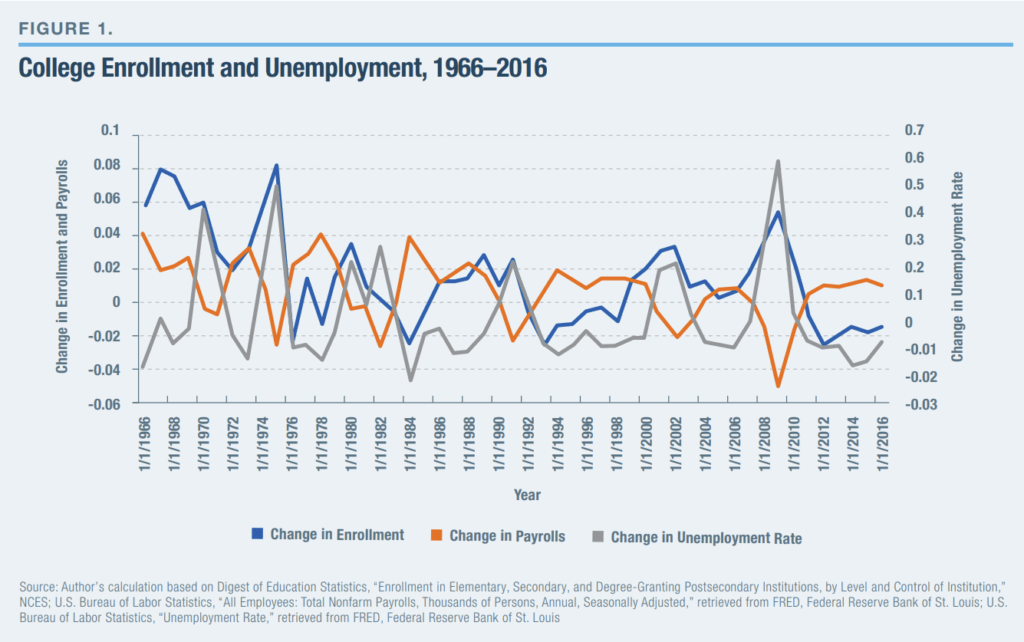 Figure 1 shows the relationship between changes in postsecondary enrollment and unemployment rates over a 50-year period, from 1966 to 2016.[14] Changes in the unemployment rate correlated strongly with changes in the rate of college enrollment. And even though payrolls and enrollment were correlated, payrolls did not appear to drive enrollment.