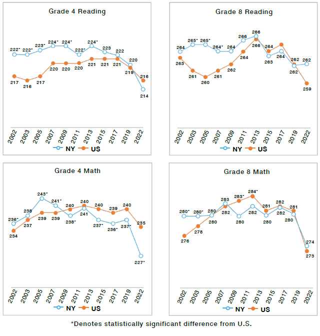 - In grade 4 Reading, New York’s average score in 2019 was statistically unchanged from 2002, indicating no improvement. The national average during the same period was a statistically significant increase of one point. In 2022, after pandemic shutdowns, the state’s scores declined to a statistically significant eight points below the 2002 level, while scores nationally were unchanged from 2002.