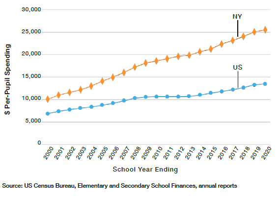 NY vs. US Per-Pupil K–12 Spending (2000–2020)